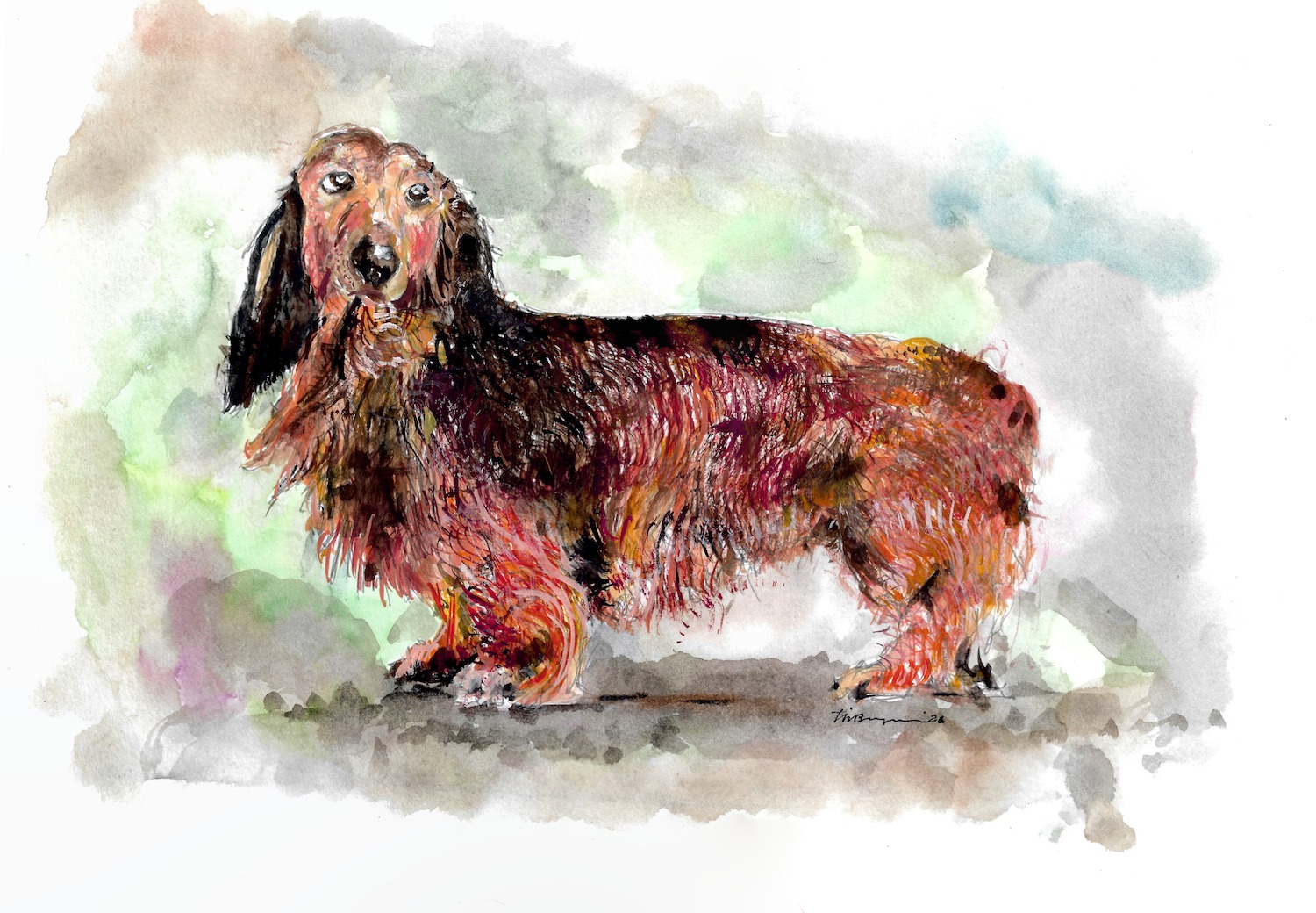 Dorothy the Dachshund. A new and exciting series of greetings cards created by Tim Baynes Art. Illustrated by Tim in gouache, wash and ink.